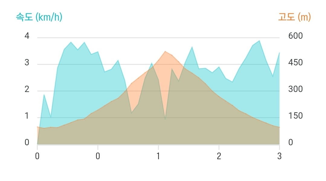 | 소요 시간 및 구간 정보 | (시간) 총 1시간 55분, 휴식 10분/ (거리) 3.87km / (누적고도) 448m |