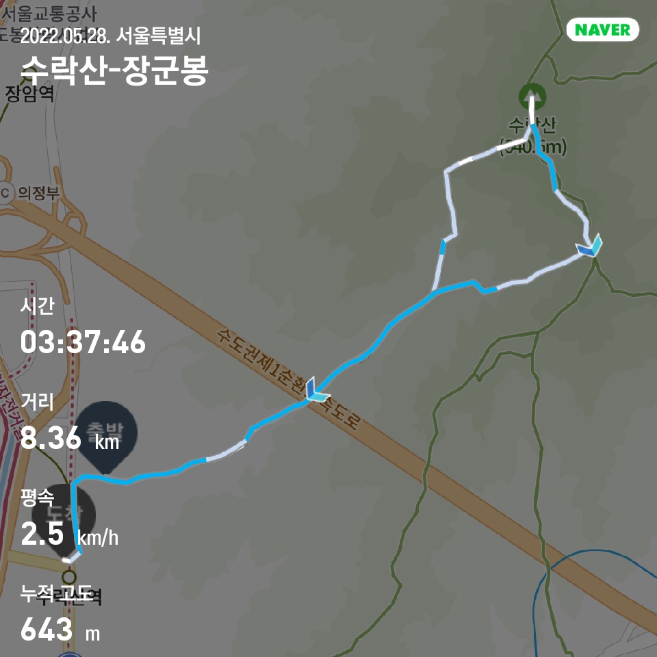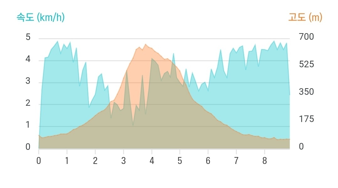 | 소요 시간 및 구간 정보 | (시간) 3시간 37분/(거리) 8.36km/(누적고도) 643m |