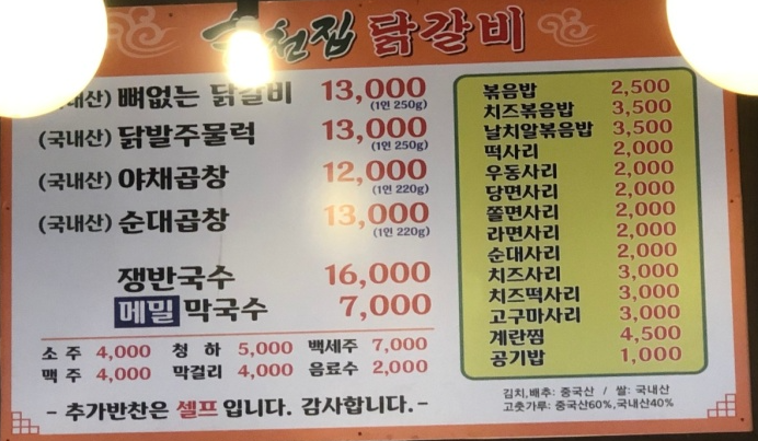 메뉴는 이렇게 있는데, 우리는 뼈 없는 닭갈비, 계란찜을 주문했다.
