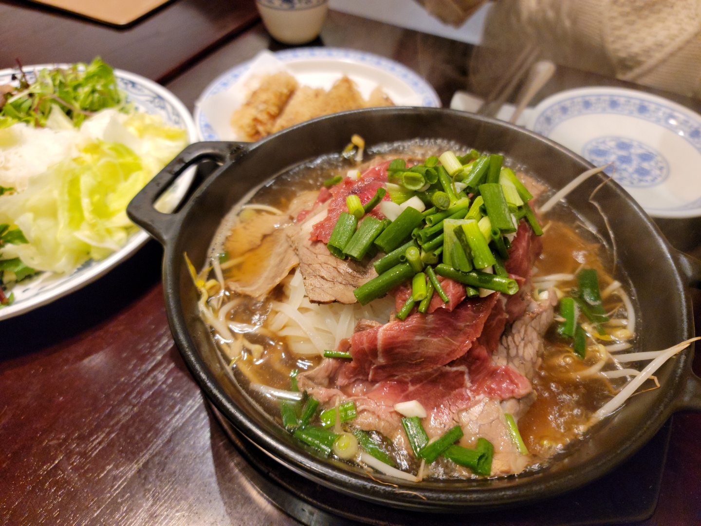 시큼새큼한 소스에 얇은 면, 채소, 간장 불고기 같은 고기를 얹어서먹는데 맛있다.